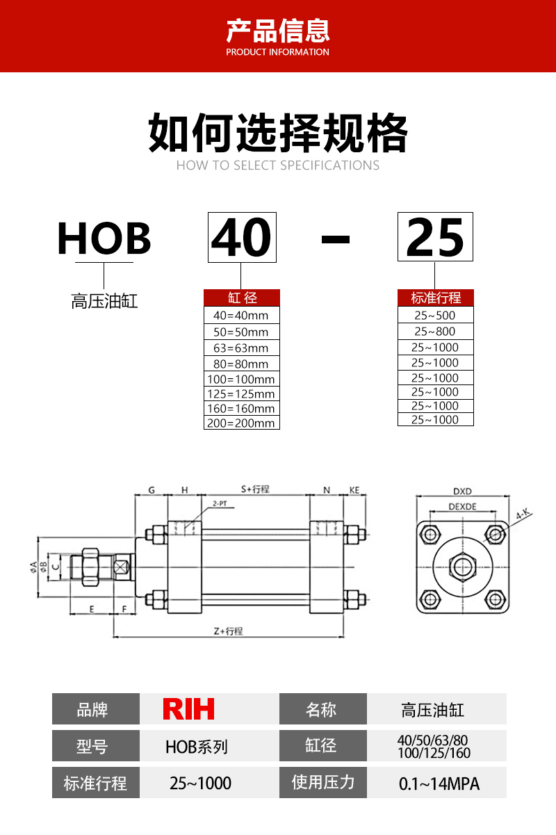 HOB重型拉杆油缸,属于双作用油缸,前后缸盖通过四根螺丝杆链接,拆装维修方面,常用于磨具行业、包装机械行业等。标准HOB轻型拉杆油缸,使用压力14MPa,试验压力21MPa,由于压力属于中高压,油缸各个配件强度要求足够。
