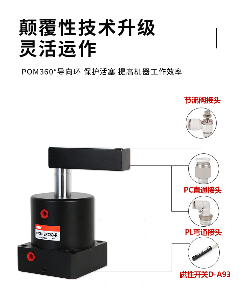 SRC气缸是90度转角气缸,其行程是由旋转行程和夹紧行程2个部分组成的,并使用时夹紧动作务必发生在夹紧行程中。瑞亨气动生产的SRC转角气缸,旋转槽采用特殊硬质处理,硬度和使用寿命是同行的二倍以上,SRC气缸适合空间狭小的环境下使用,是工业自动夹紧中常用的转角下压夹紧气缸
