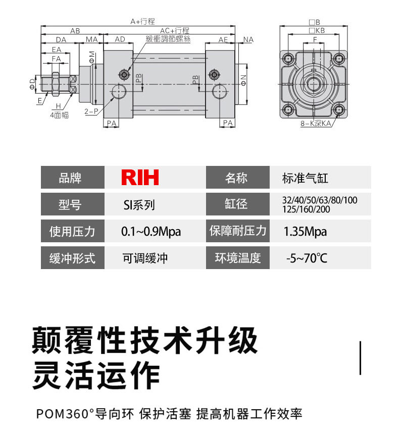 服务于自动化系统配套与解决方案SI气缸为ISO15552(ISO6431)标准气缸,活塞密封采用两个Y型单向密封结构,有补偿功能,寿命长,启动压力低,缸筒为米字型,无拉杆,防腐蚀性好,气缸缓冲调节平稳,多种规格的气缸及气缸安装附件可供客户选择使用