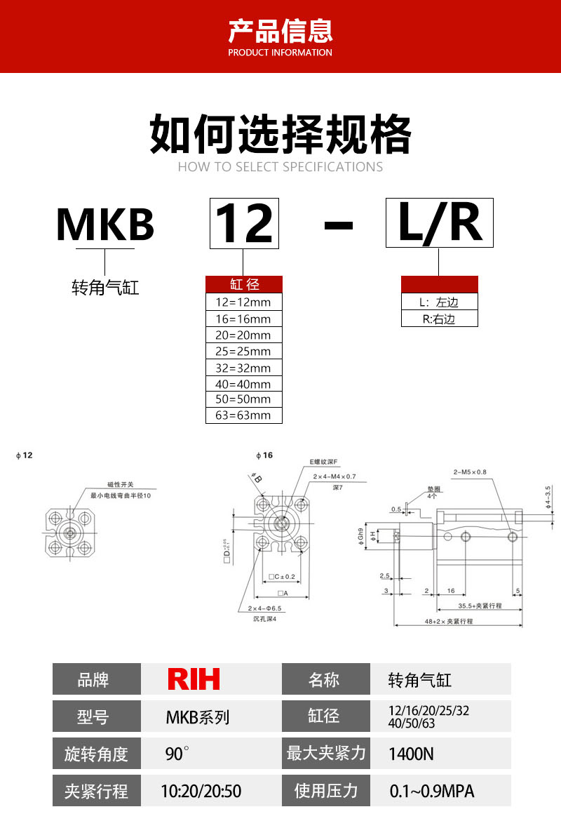 MK旋转气缸主要应用于自动化生产车间夹紧物体的作用,旋转夹紧气缸旋转方向分为(左L)(右R)两种。