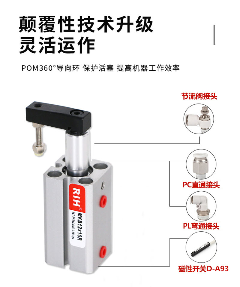 服务于自动化系统配套与解决方案SMC型MK旋转夹紧气缸,其行程是由旋转行程和夹紧行程2个部分组成的,并提示使用这种气缸时,夹紧动作务必发生在夹紧行程中。瑞亨气动生产的MK旋转夹紧气缸能够完全代替SMC气缸,旋转槽采用特殊硬质处理加工工艺,硬度和使用寿命是同行的二倍以上。