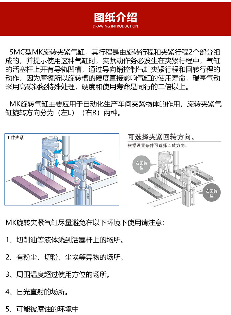 SMC型MK旋转夹紧气缸,其行程是由旋转行程和夹紧行程2个部分组成的,并提示使用这种气缸时,夹紧动作务必发生在夹紧行程中,气缸的活塞杆上开有导轨凹槽,通过导向销控制气缸夹紧行程和回转行程的动作,因为摩擦所以旋转槽的硬度直接影响气缸的使用寿命,瑞亨气动采用高碳钢经特殊处理,硬度和使用寿命是同行的二倍以上。