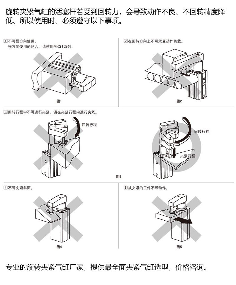 旋转夹紧气缸的活塞杆若受到回转力,会导致动作不良、不回转精度降低、所以使用时、必须遵守以下事项。